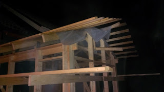Tänään oli pojat saaneet kuistin kattoa eteenpäin - kattotuolit, aluskate, rimat ja melkeinpä kokonaan rimoituksetkin.